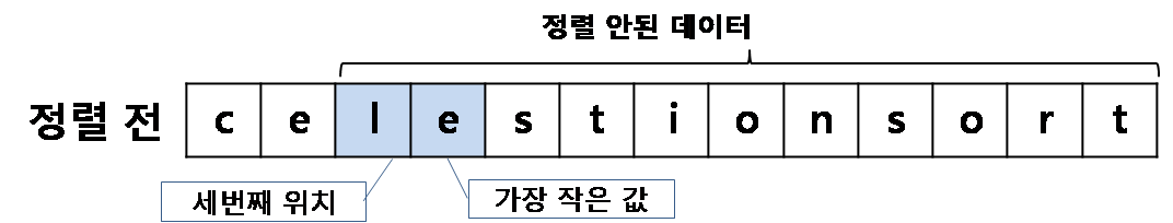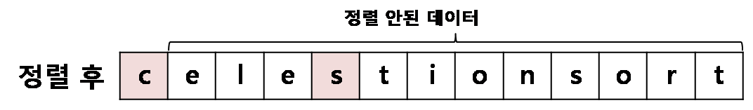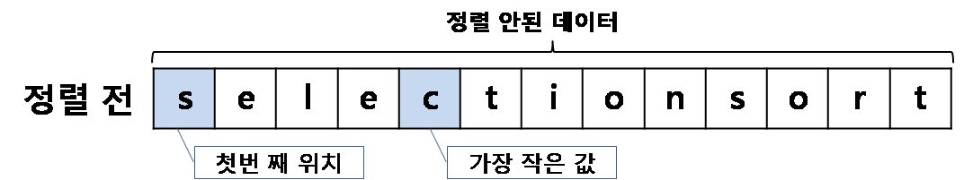가장 먼저 첫번째 요소인 's'부터 데이터 중 가장 작은 값인 'c'를 찾아서 서로 값을 교환하면 아래와 같은 결과를 얻습니다.