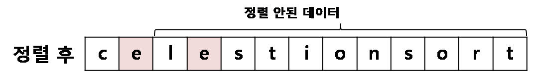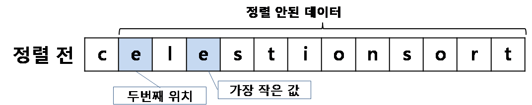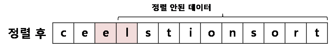 두 번째 수행에서는 두번째 요소인 'e'에서 시작하여 가장 작은 값을 찾아내어 각 요소를 바꾸는데 같은 'e'가 가장 작은 값이라 내용에 변화는 없어 보입니다.