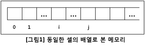 [그림1]은 0부터 번호가 부여된 크기가 같은 셀로 구성된 커다란 배열로 볼 수 있습니다. 각 셀은 하나의 문자를 저장할 공간을 가지며, 번호는 배열의 인덱스로 셀의 주소라고 할 수 있습니다.