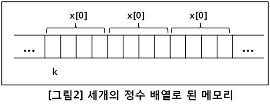 이는 변수타입의 n개의 변수를 가지는 배열 x[]를 생성하며, 각 변수들은 연속된 메모리에 위치하게 됩니다. n이 3이고 변수타입이 int인경우는 다음과 같이 [그림2]와 같이 표현하며,