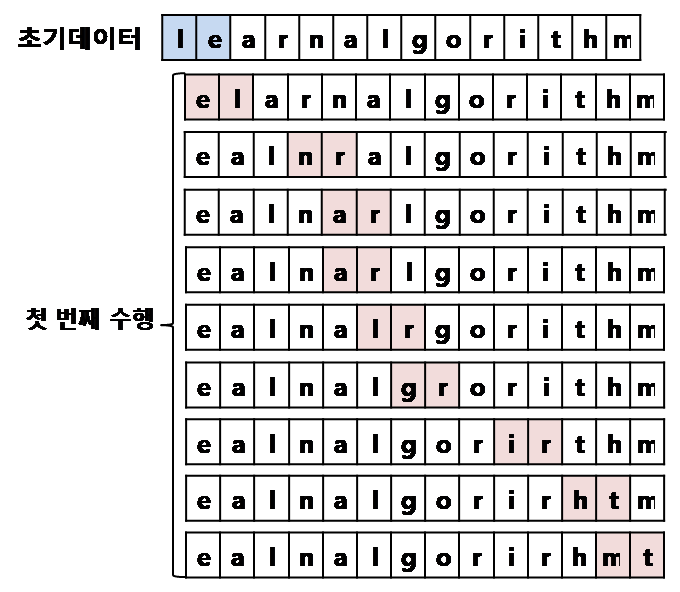 두 번째 수행의 경우엔 't'를 제외한 나머지 요소 중 가장 큰 값인 'r'이 't' 앞에 놓여질 것입니다.