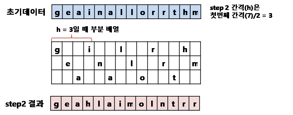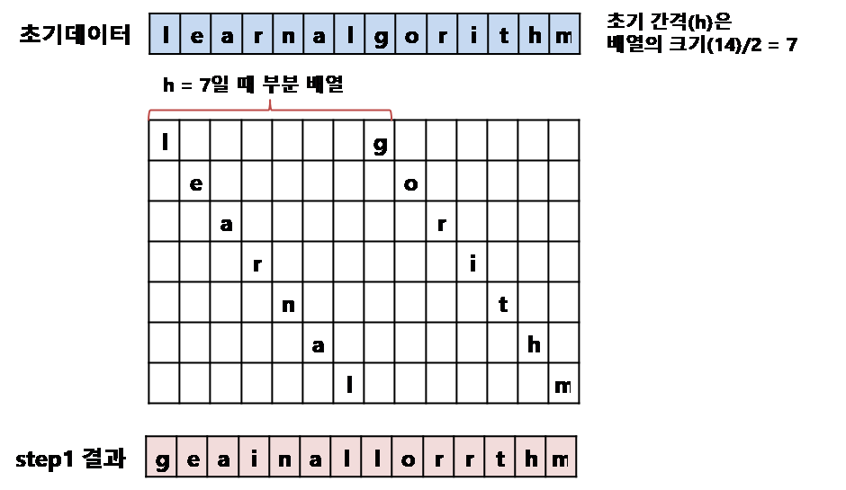 다음과 같이 문자배열이 있다고 가정하면, 첫 번째 수행에서는 배열의 크기가 14이고 h의 초기값을 배열의 크기/2로 잡아 7로 설정하면 그림과 같이 각 7번째 요소끼리 삽입정렬을 수행합니다.