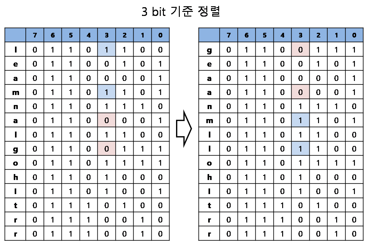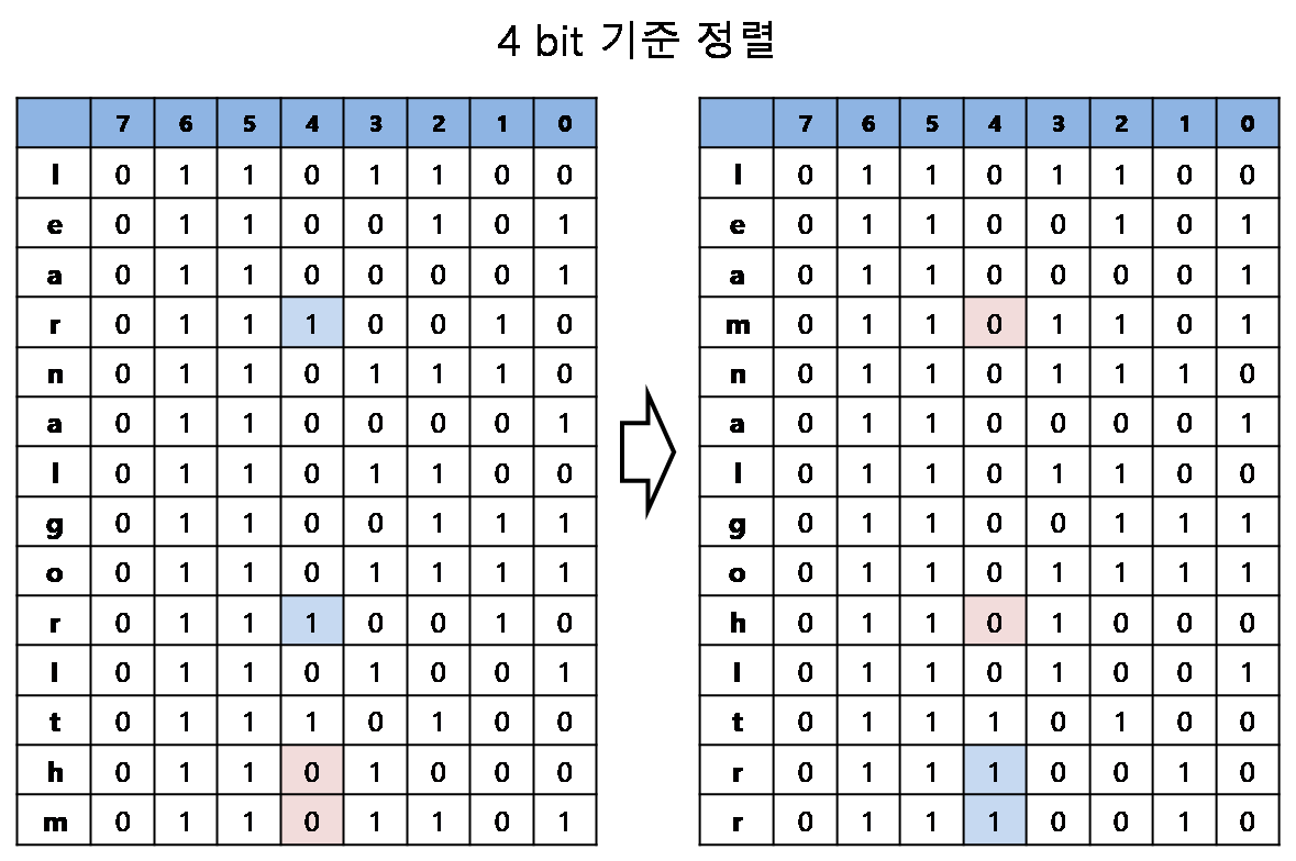 이제 3비트를 보면 'learmnalgohl'과 'trr'을 나눠서 생각할 수 있는데, 앞의 문자열을 '0'과 '1'의 순으로 교환을 하면 7~3비트까지 정렬이 됩니다. 나머지 2~0비트도 같은 방식으로 정렬을 할 수 있습니다.