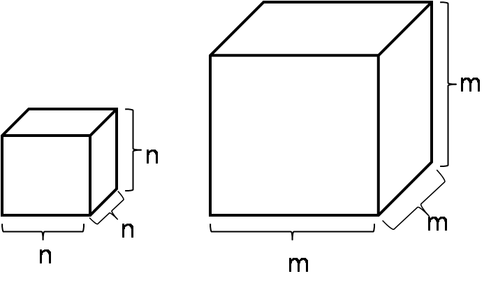 정육면체의 한변의 길이는 각각 n, m이므로 길이의 비는 n:m 이 됨을 알 수 있습니다.