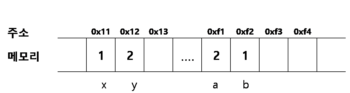 위와 같이 변수들이 서로 다른 메모리에 각각 잡히게 됩니다. 실제 swapint에서 값을 교환할 때는 x, y변수가 아닌 a, b변수의 값을 교환합니다. 그러므로 swapint에서 값을 교환한 다음의 메모리는 다음과 같습니다.
