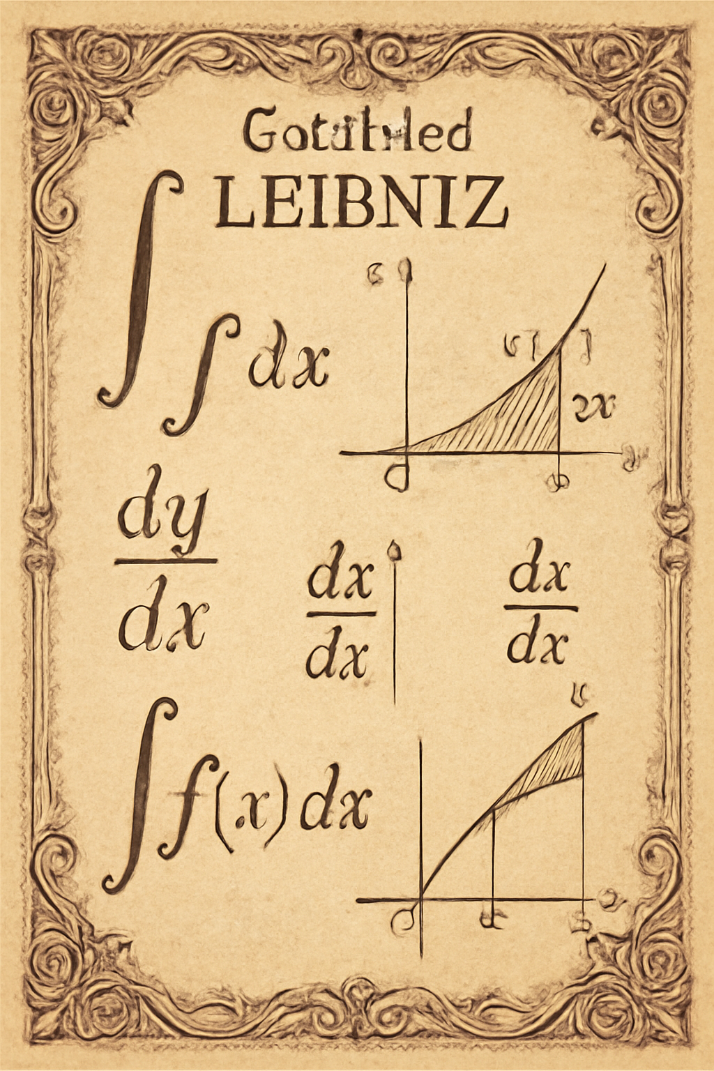 - 미분 기호(Differential): 그는 변수 $x$의 아주 작은 변화량(무한소)을 'dx', 그에 따른 함수 $y$의 변화량을 'dy'로 표현했습니다. 이를 통해 미분, 즉 순간 변화율을 분수 형태인 $\frac{dy}{dx}$로 나타냈습니다. 이 기호는 변화의 비율이라는 미분의 개념을 명확하게 표현해 줍니다.
